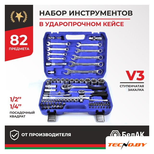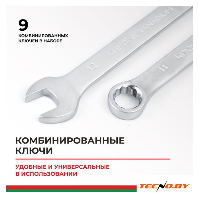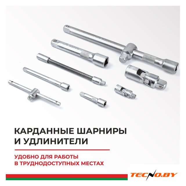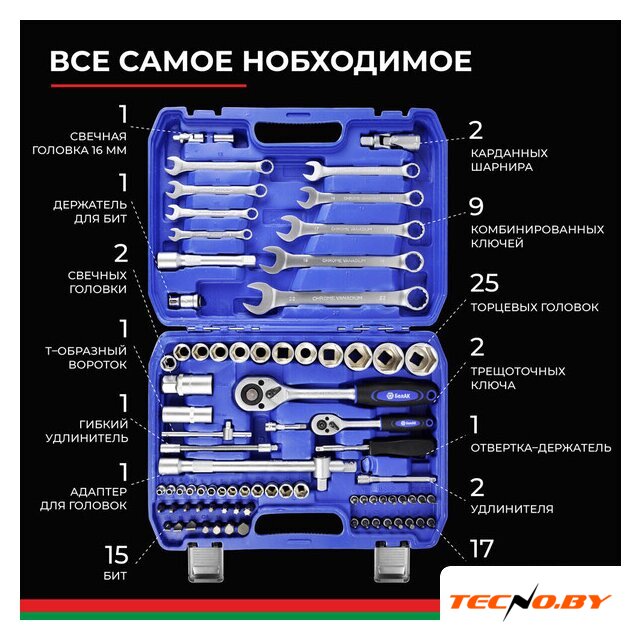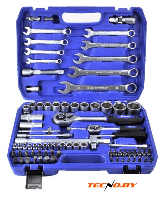 | Комплектация | кейс, держатель бит, адаптер, удлинитель, вороток, кардан, трещотка, ключи (комбинированные 9 шт.) |