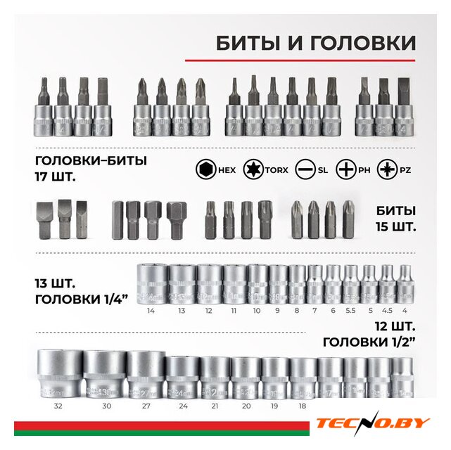 94 шт, головка простая, профиль головки: шестигранная, размер мама (F): 1/2", 1/4", рабочий размер 4-32 мм