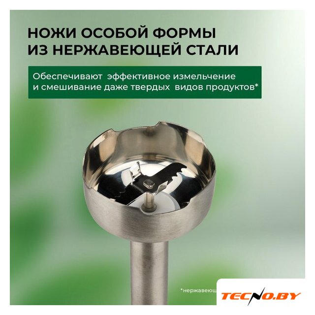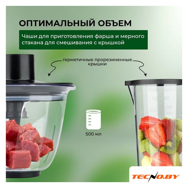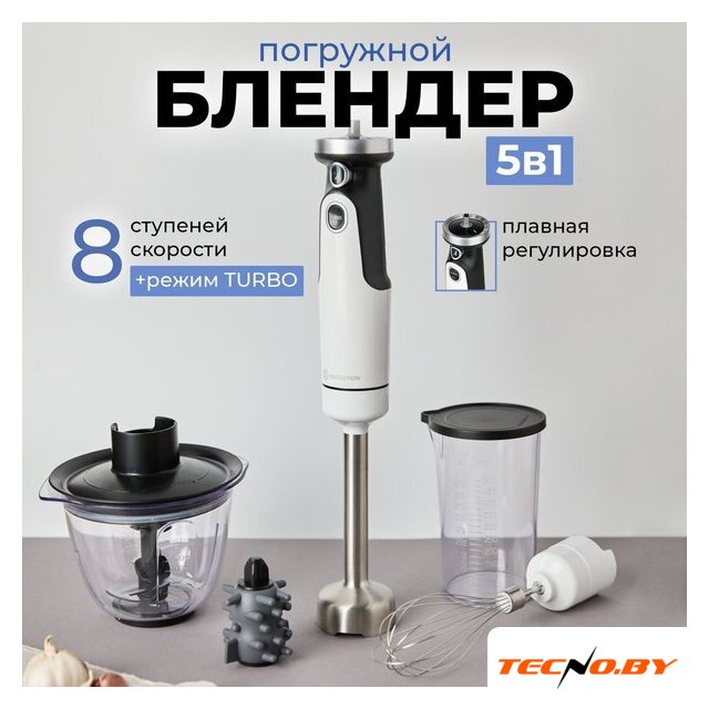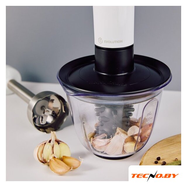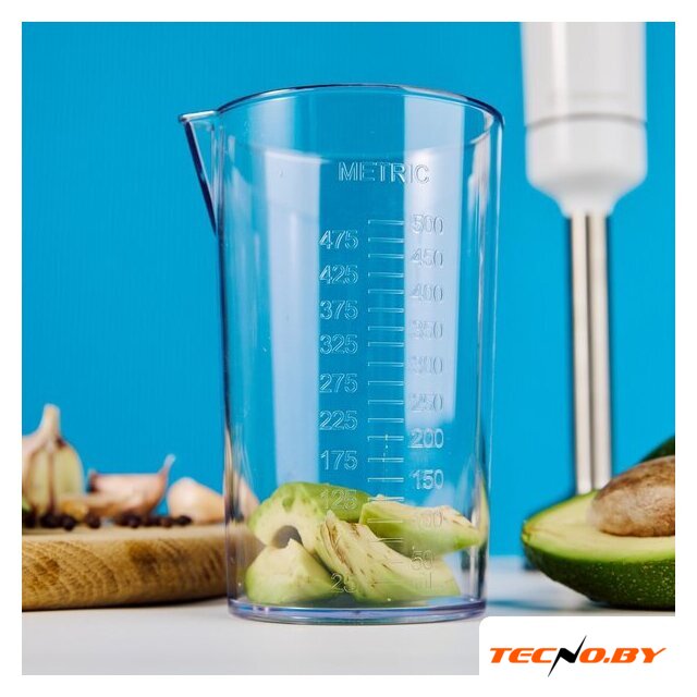 | Комплектация | Основной блок; Стакан для смешивания с крышкой 500 мл; Чаша измельчителя с крышкой 500 мл; S-образный нож; Насадка-блендер из нержавеющей стали; Венчик для взбивания; Насадка для очистки чеснока; Руководство по эксплуатации. |