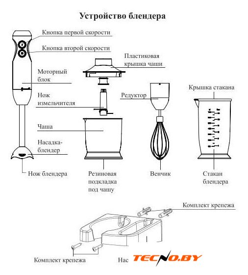 | Комплектация | - моторный блок;- насадка-блендер;- стакан;- крышка стакана;- пластиковая крышка чаши;- нож измельчителя;- чаша измельчителя;- резиновая подкладка под чашу;- венчик;- редуктор;- комплект крепежа;- настенное крепление;- руководство по эксплуатации. |