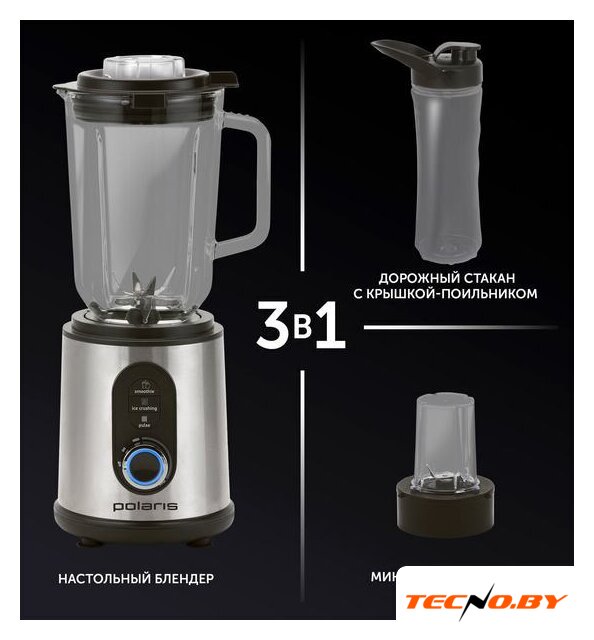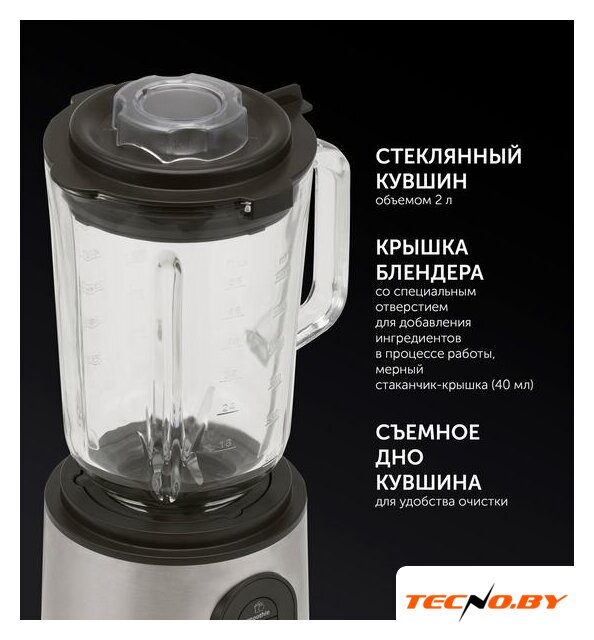 | Комплектация | 1. Мерный стаканчик-заглушка2. Крышка кувшина3. Кувшин блендера4. Съемное дно блендера с ножами5. Корпус прибора6. Дорожный стакан с крышкой7. Съёмное дно с ножами дорожного стакана8. Мини-измельчитель9. Съёмное дно с ножами мини-измельчителя10. Силиконовые уплотнительные кольца разных диаметров11. Руководство по эксплуатации12. Гарантийный талон13. Упаковка (полиэтиленовый пакет + коробка) |
