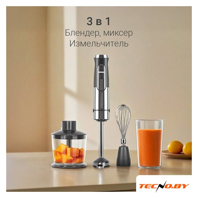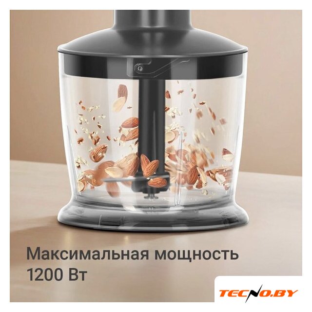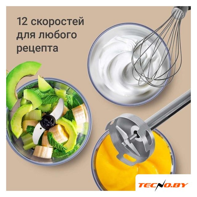| Комплектация | блок электродвигателя, чаша измельчителя с крышкой, насадка-блендер, насадка-венчик, переходник для насадки-венчика, стакан для смешивания, S-образный нож, сервисная книжка, руководство по эксплуатации |