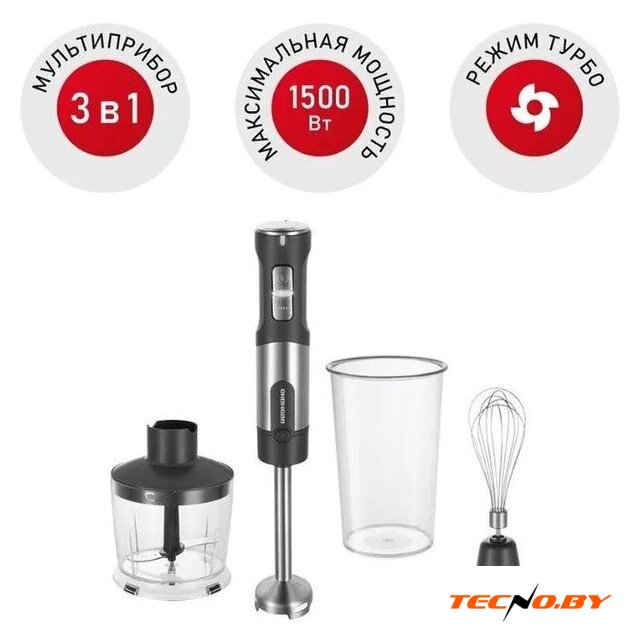 Комплектация | - Блок электродвигателя- S-образный нож- Насадка-блендер- Насадка-венчик- Переходник для насадки-венчика- Чаша измельчителя с крышкой- Стакан для смешивания- Руководство по эксплуатации- Сервисная книжка |