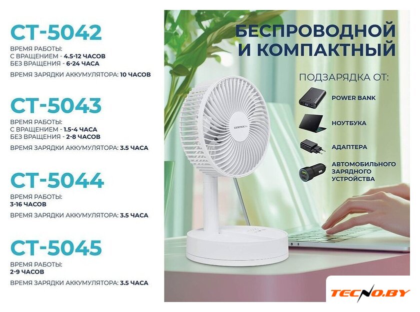 настольный, мощность 5 Вт, DC двигатель, 4 скорости, управление механическое, лопасти 10 см, питание: аккумулятор