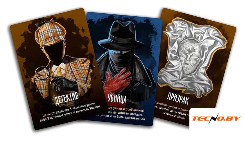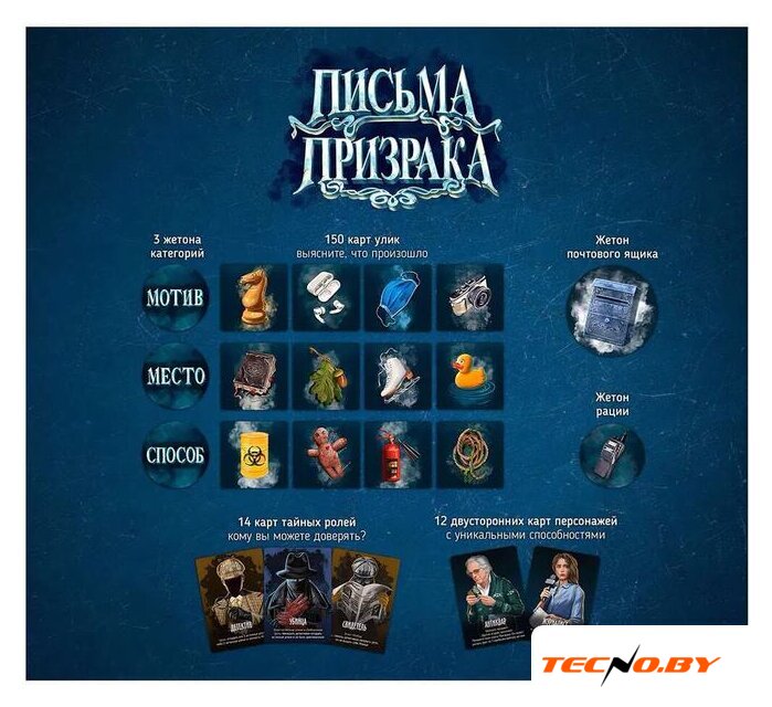 Комплектация | - 150 карт улик- 14 карт тайных ролей- 12 карт персонажей (двусторонние)- 3 жетона категорий- 1 жетон рации- 1 жетон почтового ящика- карта-памятка- правила игры |