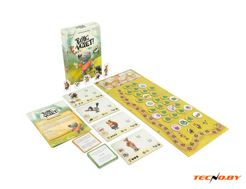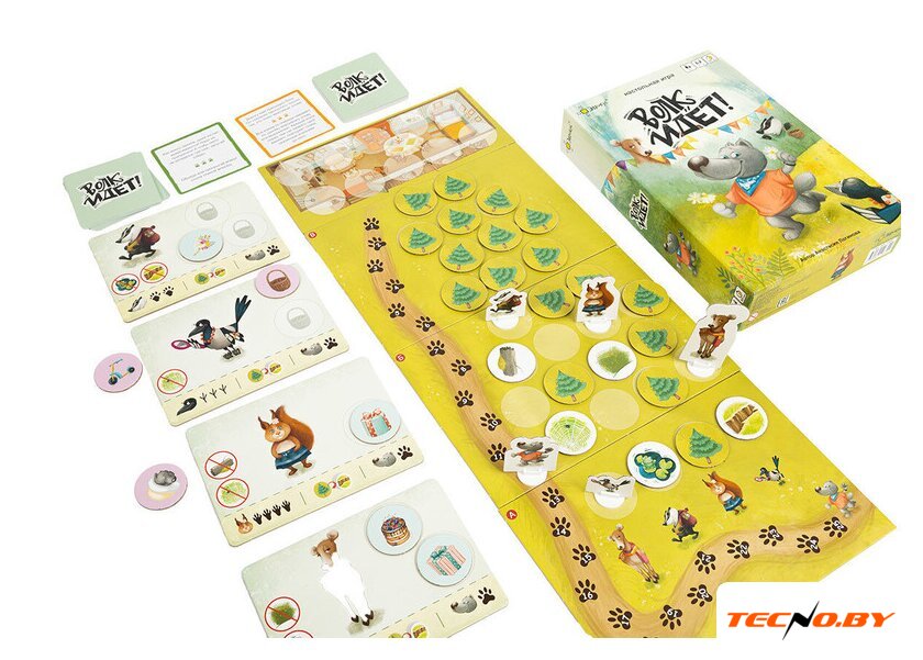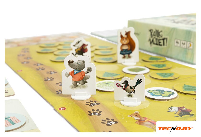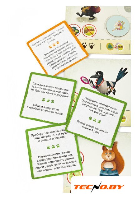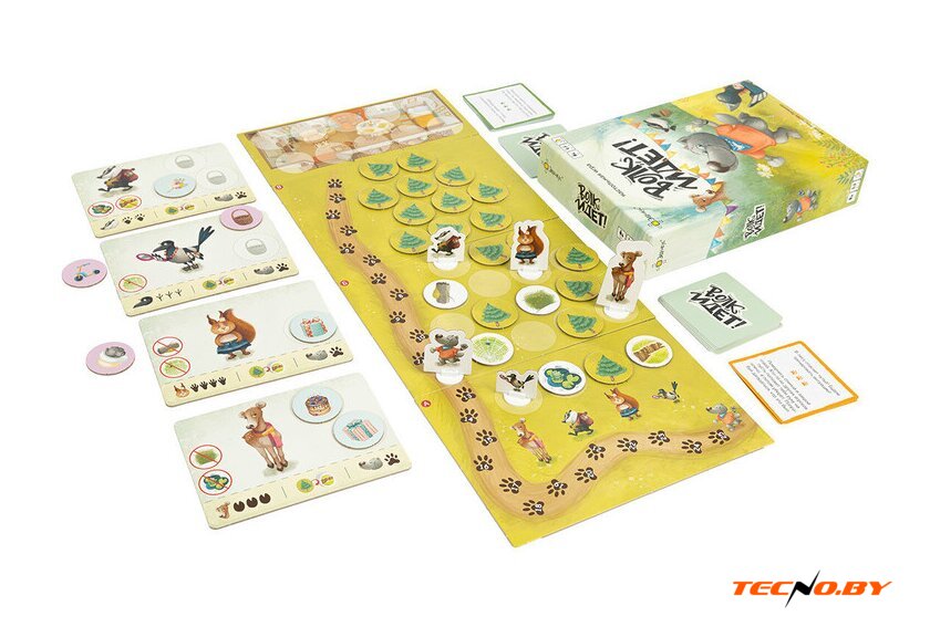 Комплектация | 1. 5 фигурок животных с подставками2. 4 планшета героев3. 4 части игрового поля4. 30 жетонов леса трёх видов5. 30 карточек заданий6. Правила игры |