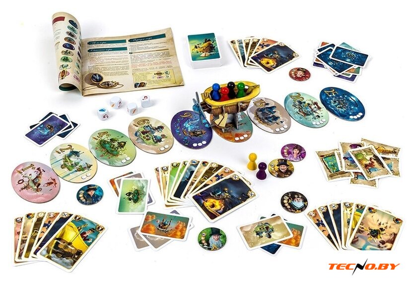 Комплектация | - Воздушный корабль- 6 фигурок искателей приключений- 6 жетонов искателей приключений- 9 жетонов городов- 4 кубика препятствий- Правила игры- 78 карт сокровищ- 68 карт снаряжения- 8 карт турбо-эффекта- 8 карт силы |