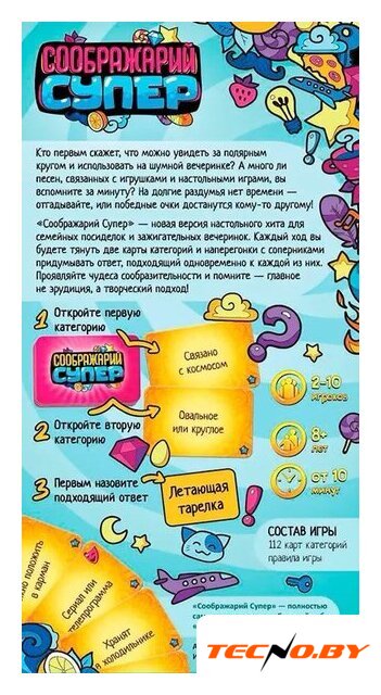 логическая/детская/карточная, жанр: коммуникация и общение/дедуктивная/образовательная или творческая, количество игроков: 2–10, возраст: 7 лет, партия 10 мин
