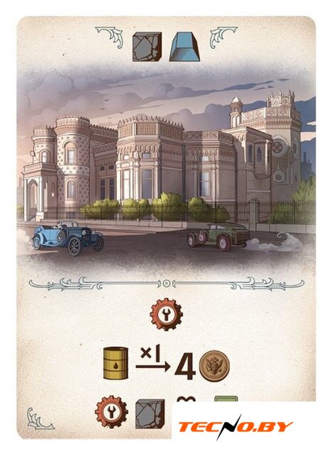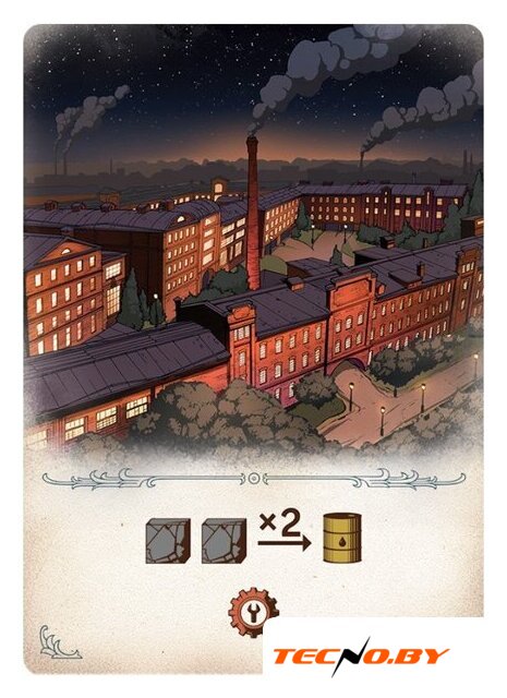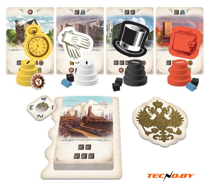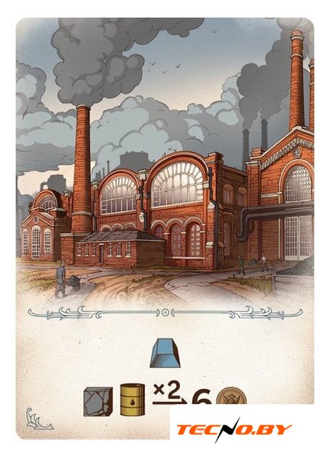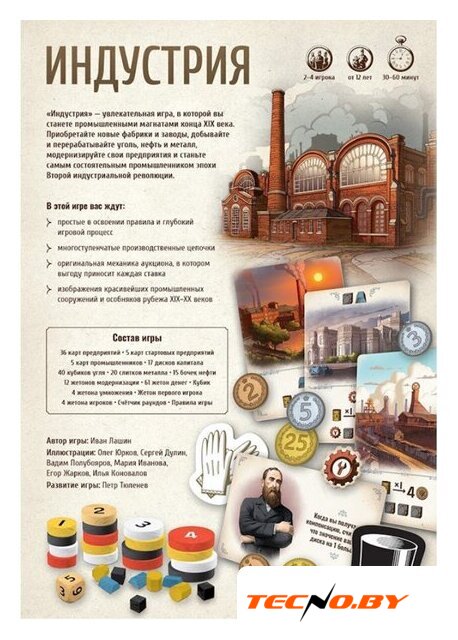 Комплектация | 36 карт предприятий, 5 карт стартовых предприятий, 5 карт промышленников, 17 дисков капитала, 40 кубиков угля, 20 слитков металла, 15 бочек нефти, 12 жетонов модернизации, 61 жетон денег, кубик, 4 жетона умножения, жетон первого игрока, 4 жетона игроков, счетчик раундов, правила игры |