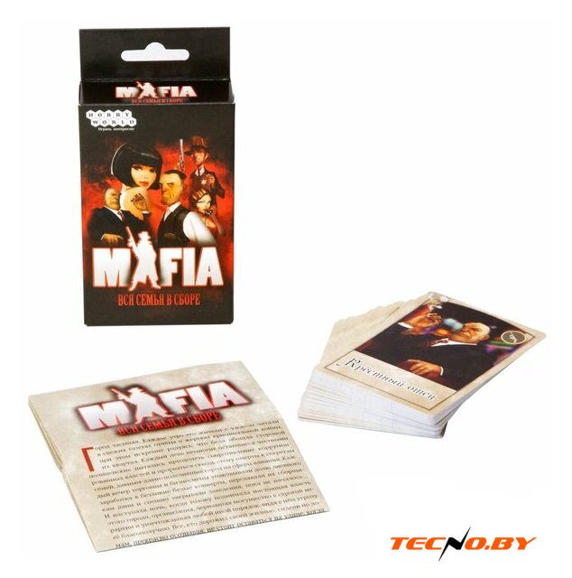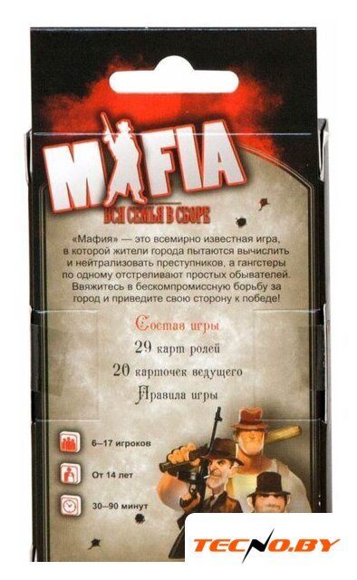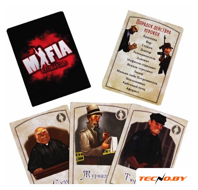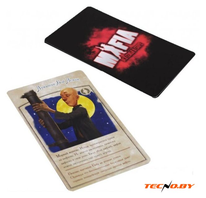 | Комплектация | - 29 карт ролей: 5 лидеров мирных жителей 5 особых мирных жителей 5 обычных мирных жителей 3 одиночки 4 особых мафиози 4 обычных мафиози 3 якудзы- 20 карточек для ведущего- Правила игры |
