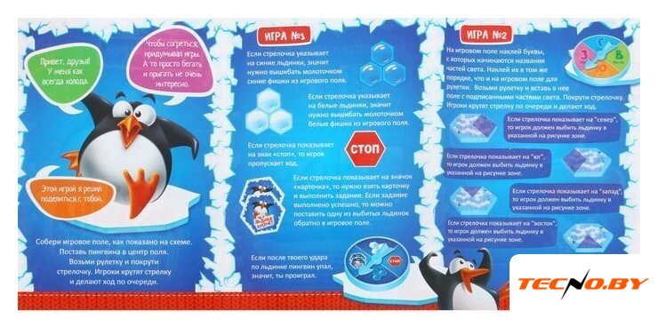 | Комплектация | - игровое поле;- рулетка;- 2 поля для рулетки;- фигурка пингвина;- 2 молотка;- игровые карточки;- инструкция. |