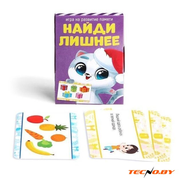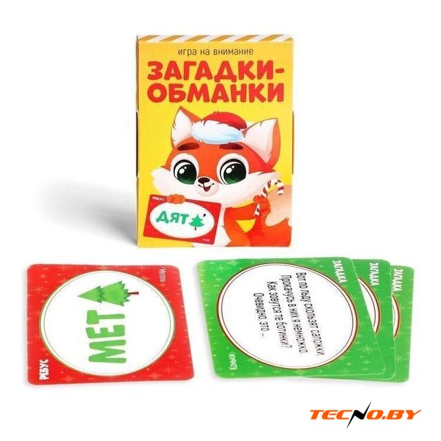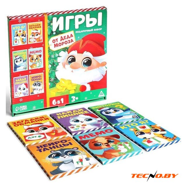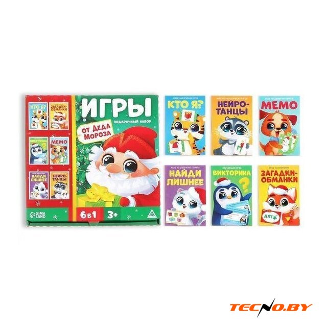 Комплектация | «Нейротанцы» — нейропсихологическая игра, в которой участникам предстоит повторять необычные позы.«Мемо» — ищите парные картинки и развивайте внимание и память.«Найди лишнее» — ищите лишние предметы или персонажей на карточках. С помощью этой игры ребёнок научится группировать предметы по общему признаку.«Кто Я?» — угадывайте слова, которые находятся прямо у вас на лбу! В этом помогут вопросы, на которые можно ответить только «да» или «нет».«Загадки-обманки» — отгадывайте загадки с подвохом и развивайте логику. Сами загадки в стихах, а вот правильный ответ не рифмуется.«Викторина» — отвечайте на вопросы, связанные с Новым годом, и веселитесь. Расширяйте кругозор в игровой форме! |