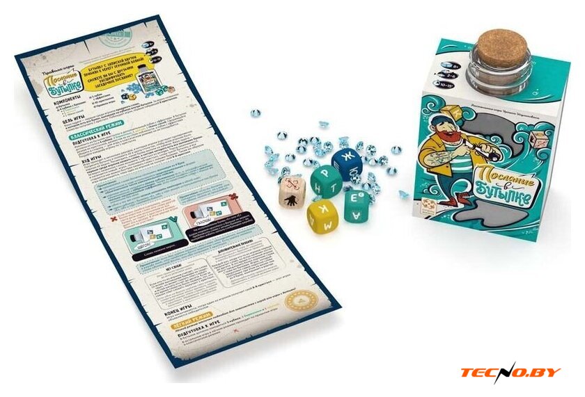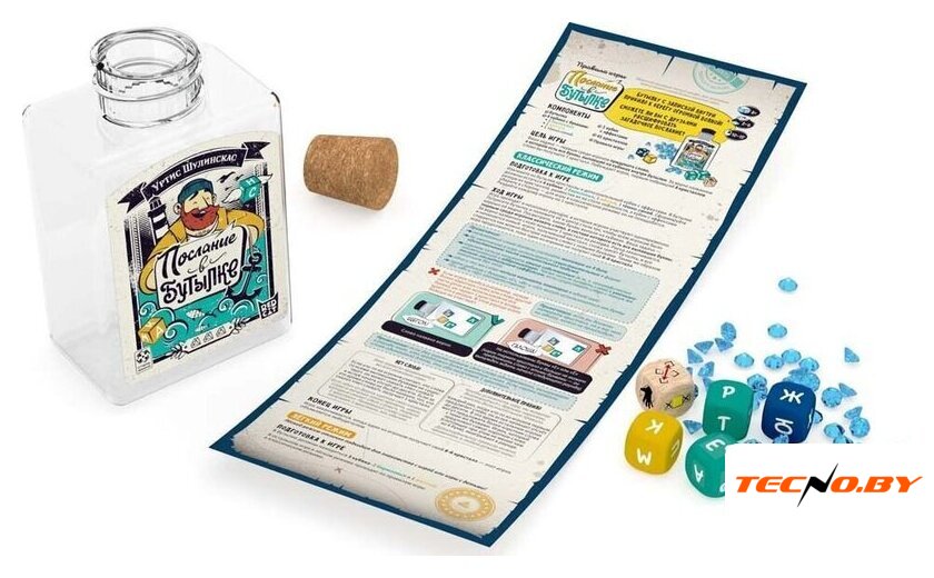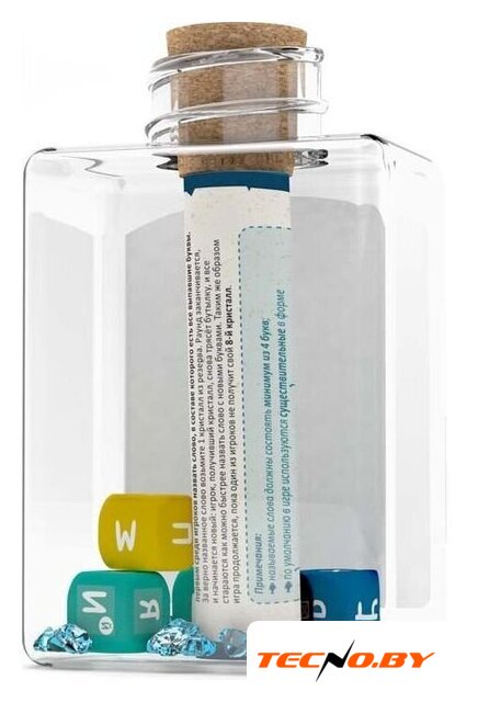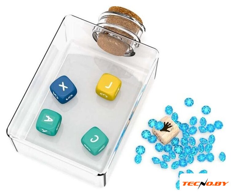 Комплектация | 1 бутылка, 4 кубика с буквами, 1 кубик с эффектами, 45 кристаллов, правила игры |