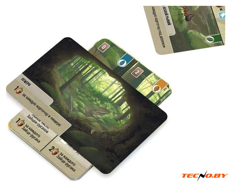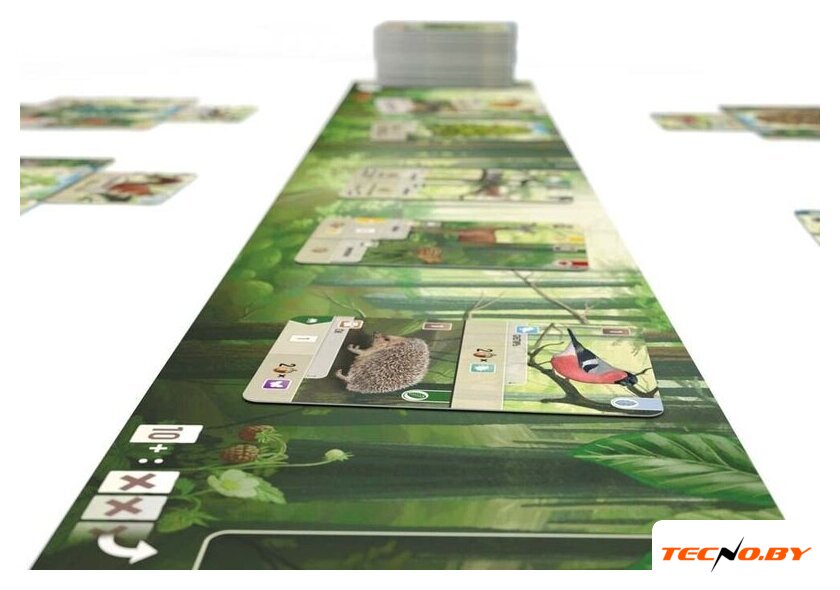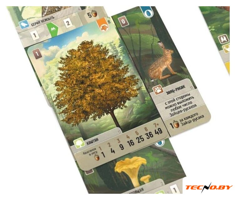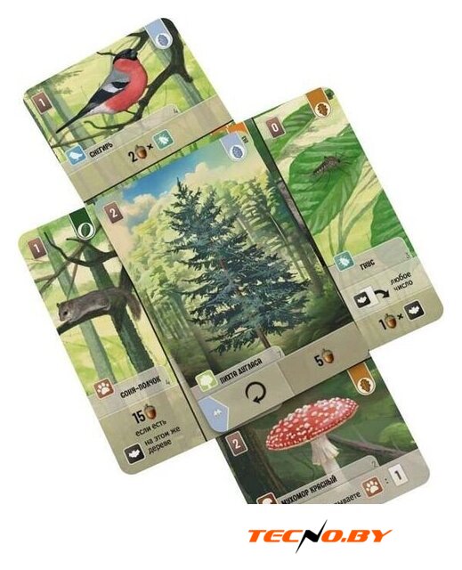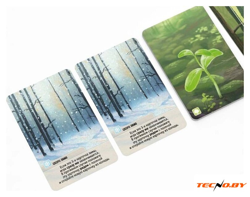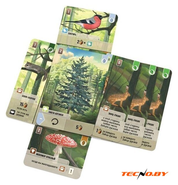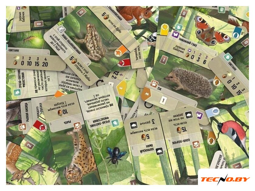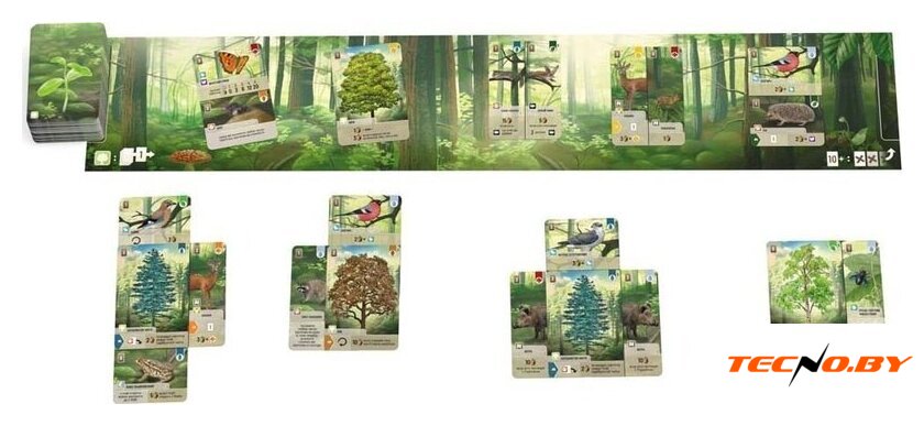 Комплектация | 1 игровое поле, 180 карточек, 66 карточек деревьев, 48 карточек обитателей с разделением на верх и низ, 44 карточек обитателей с разделением на лево и право, 3 карточки зимы, 5 карточек пещер, 14 справочных карточек, 1 блокнот для подсчёта очков, правила игры |