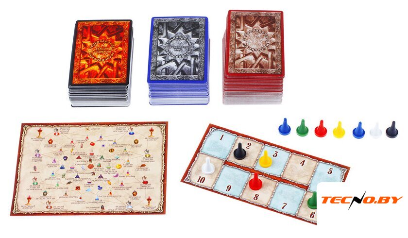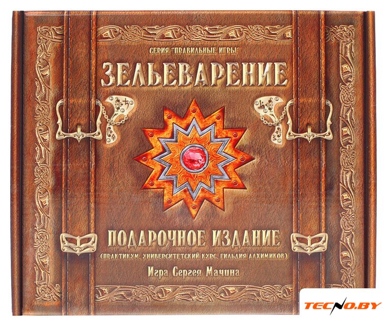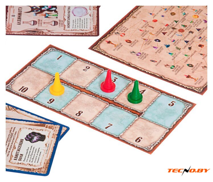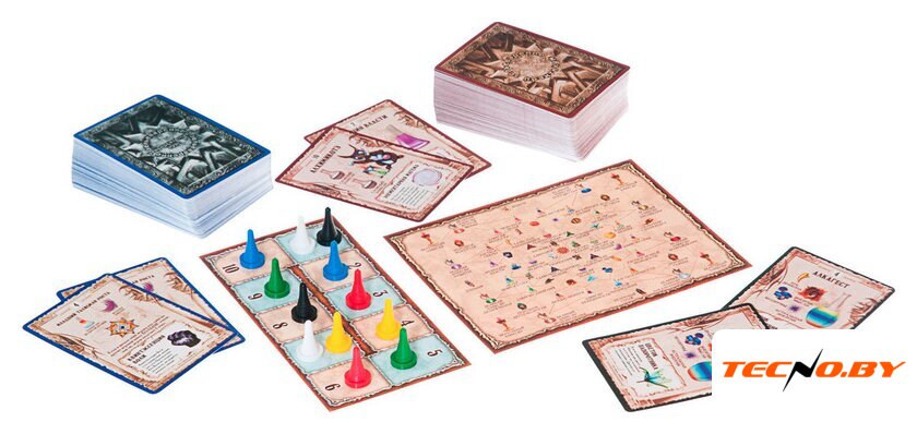 Комплектация | - Практикум (76 карт, фишки игроков, счетчик очков, правила)- Университетский курс (63 карты, правила)- Гильдия Алхимиков (54 карты, правила, 9 карт Последовательности)- карта "Алхимикотэ" |