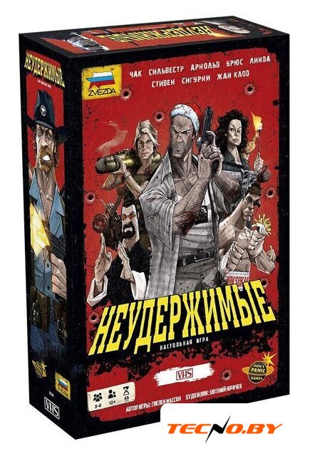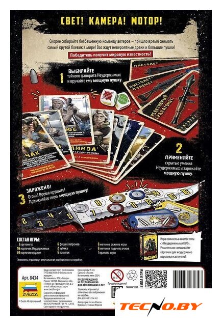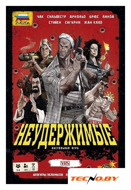 Комплектация | Правила игры, Крутометр, Карточки Неудержимых – 56 шт, Карточки оружия – 24 шт, Патроны деревянные – 6 шт, Кубики специальные – 2 шт, Жетоны режима игры и подсчета очков - по 6 шт, Памятки – 6 шт. |