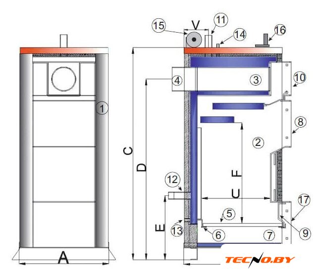 твердотопливный (дрова/пеллеты/уголь/торф), 15 кВт, 150 м², одноконтурный, напольный, закрытая камера сгорания