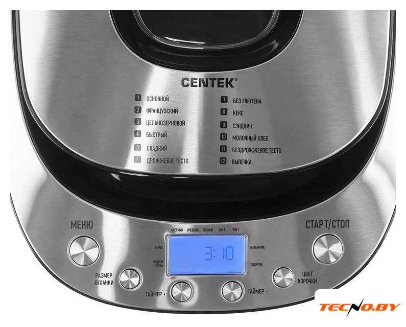 | Перечень режимов работы | «Основной хлеб», «Французский хлеб», «Цельнозерновой хлеб», «Быстрый хлеб», «Сладкий хлеб», «Дрожжевое тесто», «Хлеб без глютена», «Кекс», «Сэндвич», «Молочный хлеб», «Бездрожжевое тесто», «Выпечка» |