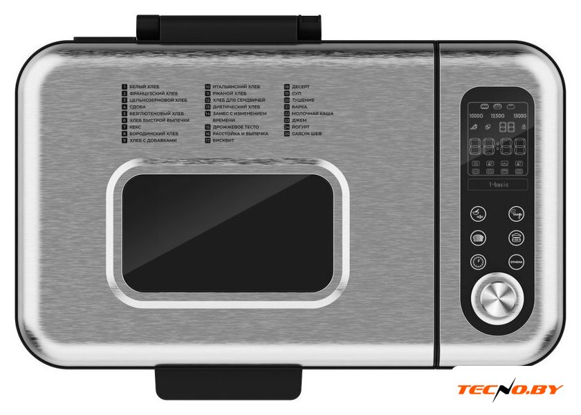 | Перечень режимов работы | 1. Белый хлеб2. Французский хлеб3. Цельнозерновой хлеб4. Сдоба5. Безглютеновый хлеб6. Хлеб быстрой выпечки7. Кекс8. Бородинский хлеб9. Хлеб с добавками10. Итальянский хлеб11. Ржаной хлеб12. Хлеб для сэндвичей13. Диетический хлеб14. Замес с изменением времени15. Дрожжевое тесто16. Расстойка и выпечка17. Бисквит18. Десерт19. Суп20. Тушение21. Варка22. Молочная каша23. Джем24. Йогурт25. GARLYN ШЕФ |