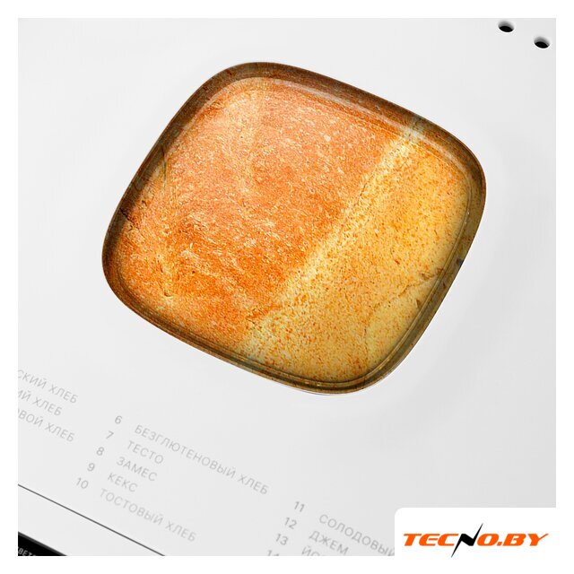 | Перечень режимов работы | 1. Классический хлеб2. Французский хлеб3. Цельнозерновой хлеб4. Быстро5. Сдоба6. Безглютеновый хлеб7. Тесто8. Замес9. Кекс10. Тостовый хлеб11. Солодовый хлеб12. Джем13. Йогурт14. Выпечка15. Ручной режим |
