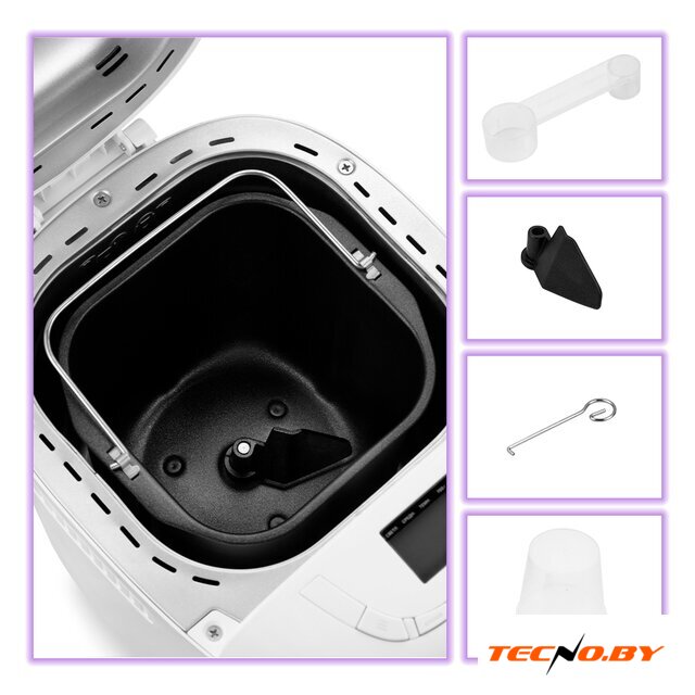| Комплект поставки | • хлебопечь с формой для выпечки;• перемешивающая лопатка;• мерный стакан;• мерная ложка;• крюк для извлечения лопатки;• руководство по эксплуатации. |