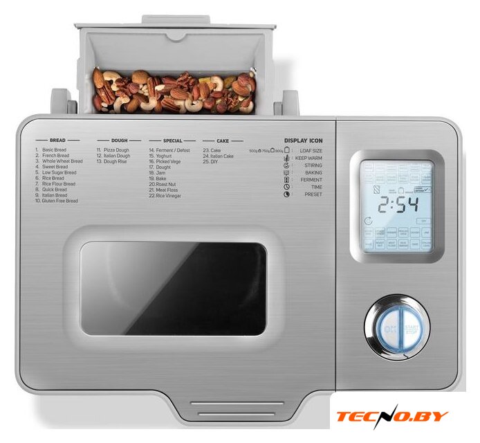 | Перечень режимов работы | 1. Основной.2. Французский хлеб.3. Хлеб из муки разового помола.4. Сладкий хлеб.5. Хлеб с низким содержанием сахара.6. Рисовый хлеб.7. Хлеб из рисовой муки.8. Быстрая выпечка.9. Итальянский хлеб.10. Хлеб без глютена.11. Тесто для пиццы.12. Итальянское тесто.13. Подъем теста.14. Брожение/размораживание.15. Йогурт.16. Маринованные овощи.17. Тесто.18. Джем.19. Выпечка.20. Жареные орехи.21. Мясные полоски.22. Рисовый уксус.23. Пирог.24. Итальянский пирог.25. Своя программа. |