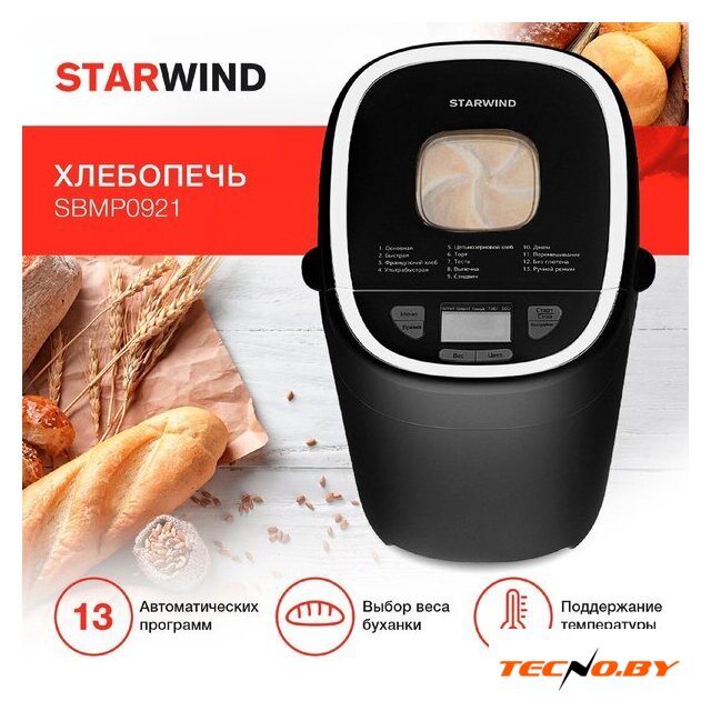 | Комплектация | Хлебопечь SBMP0921 – отличный помощник на вашем кухонном пространстве. С помощью такого бытового прибора можно запросто приготовить вкусную и ароматную выпечку прямо у себя дома. Пользоваться устройством несложно, панель управления интуитивно понятна, в комплекте предоставляется подробная инструкция с советами. Мощность хлебопечки находится на уровне 550 Вт, чего вполне достаточно для быстрого приготовления ароматной выпечки. Допускается создание буханок, вес которых может составлять 700 и 900 грамм. Опционально предусмотрена возможность выбора цвета корочки. Емкость для приготовления оснащена антипригарным покрытием, а для упрощения контроля процесса в конструктиве предусмотрено смотровое окно. Есть 13 программ приготовления, подобрать вариант с учетом личных предпочтений несложно. |
