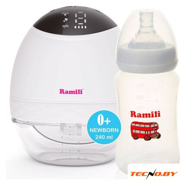 | Комплектация | дополнительные вставки, корректирующие диаметр накладки на грудь, для индивидуальной адаптации, противоколиковая бутылочка Ramili Baby 240ML |