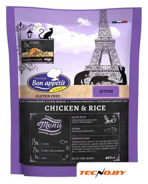 | Ингредиенты | куриное мясо 65%, рис, куриный жир (содержит токоферолы), фрукты, овощи и травы (оливковая пульпа (источник коэнзима Q10), зеленый горошек (натуральный источник железа), экстракт виноградных косточек (натуральные антиоксиданты), мякоть лимона (натуральный витамин A и B), мякоть апельсина (натуральный витамин C), мякоть и экстракт семян грейпфрута (источник биофлавоноидов), тимьян, орегано, майоран, петрушка), гидролизованный куриный белок, мякоть свеклы (источник бетаина), хлорид натрия, рыбий жир из анчоусов и сардин 0.2% (богат омега–3 и омега–6 жирными кислотами), экстракт дрожжей (природный комплекс витамина В), saccharomyces cerevisiae (маннанолигосахариды), экстракт корней цикория (фруктоолигосахариды). |