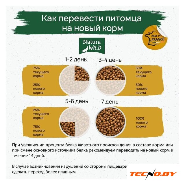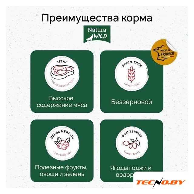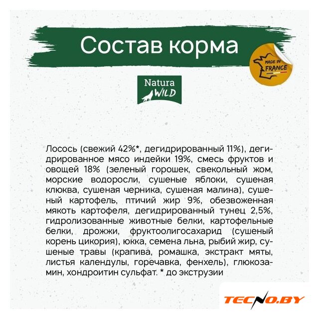 | Ингредиенты | Свежее куриное мясо 45 %* (дегидратированное 14%), обезвоженный белок птицы 25 %, смесь фруктов и овощей 15 % (зеленый горошек, мякоть цикория, юкка Шидигера, гранат, орегано, петрушка, майоран, шалфей, тимьян), сушеная ферма картофель, птичий жир 6%, сушеная картофельная мякоть, гидролизованный белок птицы 5%, гидролизат белка печени и сердца 2%, шкварки 2%, льняное семя, растительные волокна, пивные дрожжи, свекольный жом, масло лосося. * перед экструзией |