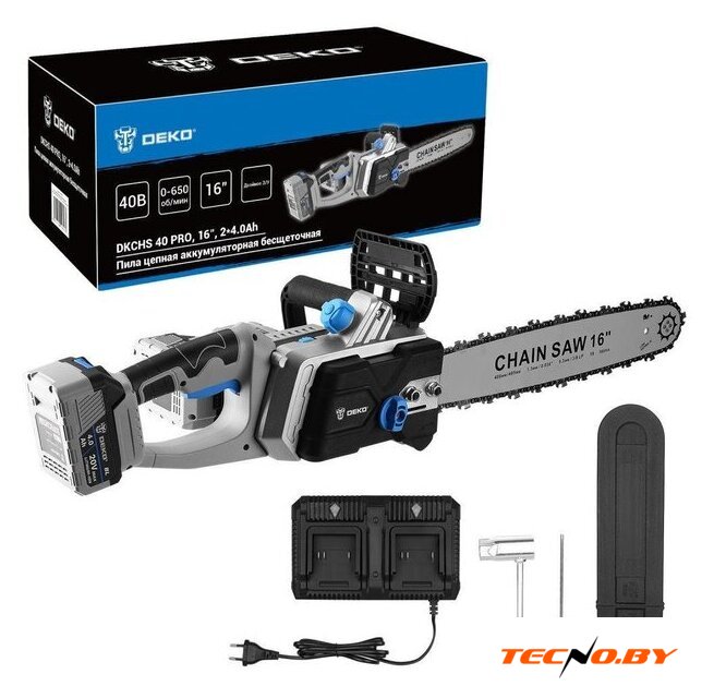| Комплект поставки | - Пила аккумуляторная - 1 шт.- Пильная шина - 1 шт.- Цепь - 1 шт.- Аккумулятор 4,0 Ач - 2 шт.- Двойное зарядное устройство - 1 шт.- Защитный кожух шины - 1 шт.- Ключ - 1 шт.- Инструкция- Коробка |