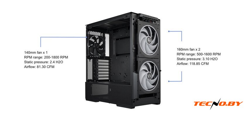 | Конфигурация вентиляторов | спереди: 3 x 120mm / 2 x 140mm / 2 x 160mmсверху: 3 x 120mm / 2 x 140mmснизу: 2 x 120mm / 2 x 140mmсзади: 1 x 120mm / 1 x 140mmкронштейн вентилятора PCIe: 1 х 120mmВ комплекте:спереди: 2 x 160mm PWMсзади: 1 x 140mm PWM |