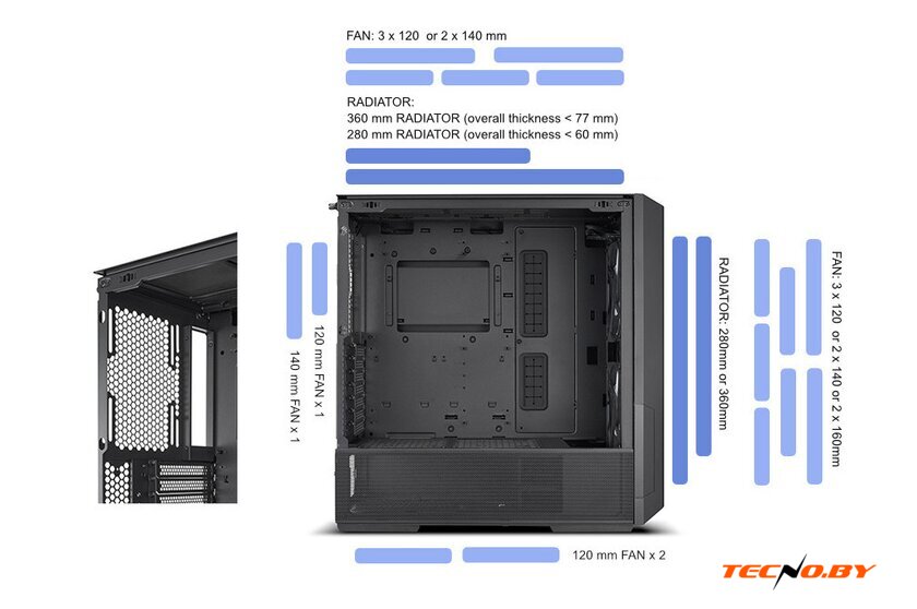 | Расположение СЖО | спереди: 360 / 280 / 240mmсверху: 360 / 280 / 240mmснизу: 240mm |