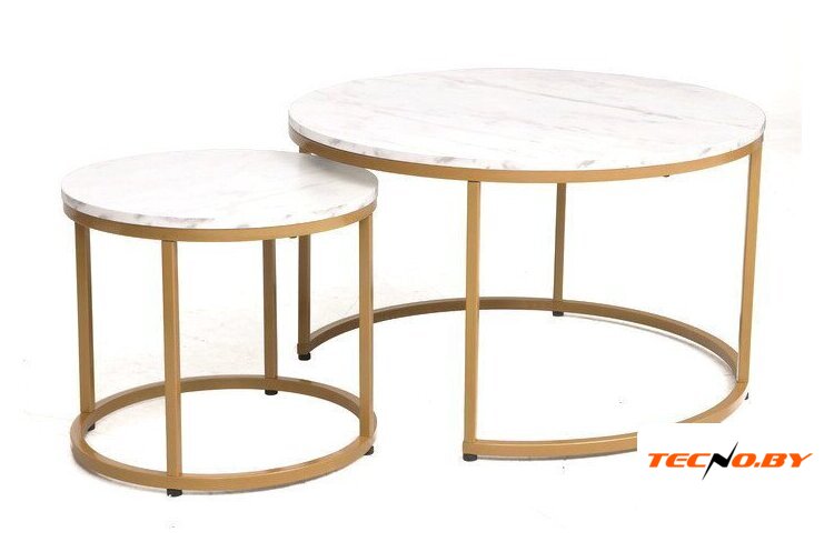 Столешницы выполнены из высококачественного ЛДСП, имитирующего белый мрамор, что придает им элегантный и современный вид. Опоры столиков изготовлены из прочной окрашенной стали, что делает их устойчивыми и долговечными. Их золотистый цвет придает изделию роскошный акцент, который прекрасно вписывается в любой интерьерный стиль.