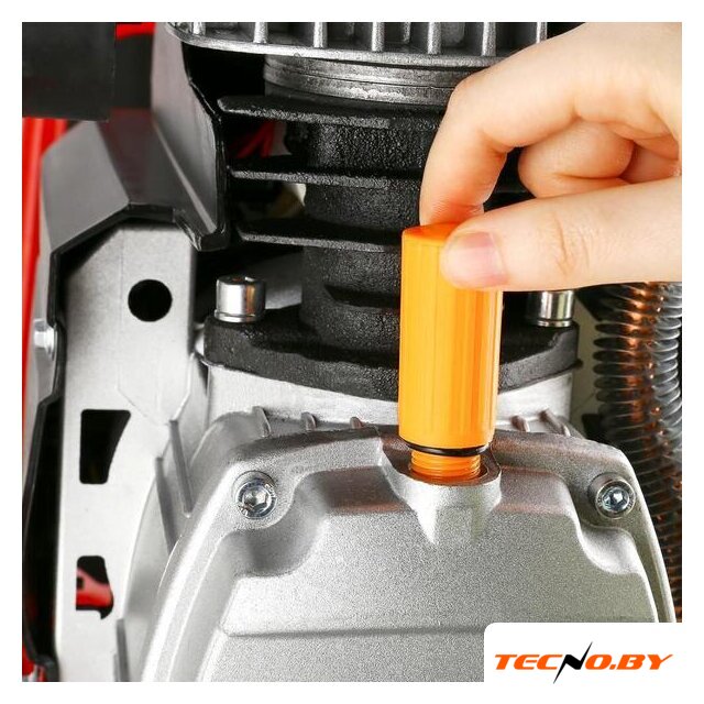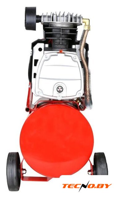 Компрессор выполнен в современном дизайне и имеет яркий красный цвет, который не только привлекает внимание, но и обеспечивает его видимость в рабочем пространстве. Данный аспект важен для безопасности, так как позволяет избежать случайных столкновений или повреждений оборудования.
