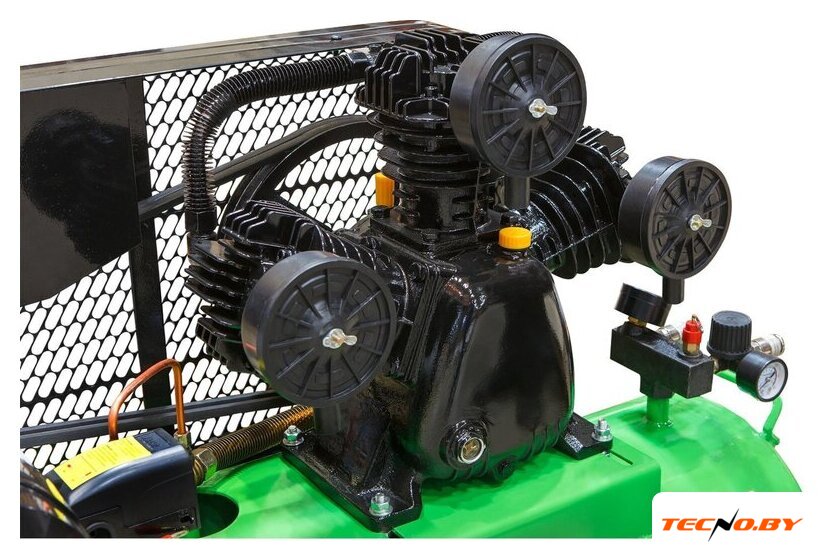 Компрессор оснащен ресивером объемом 100 литров, что позволяет ему работать дольше без необходимости постоянной перезарядки. Три цилиндра обеспечивают равномерную подачу воздуха и стабильность в работе, особенно при высоких нагрузках. Это делает его идеальным инструментом для мастерских и промышленных целей.