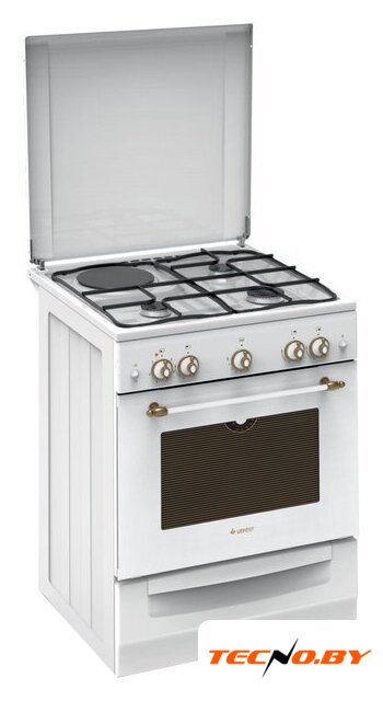 газ + электро панель + электрический духовой шкаф, поверхность: эмалированная сталь, крышка из эмалированной стали, энергопотребление B, управление механическое, таймер механический, размеры (ШхГхВ): 60x60x85 см, цвет белый