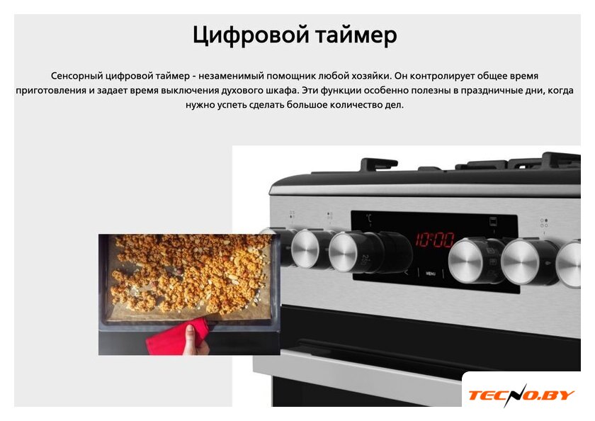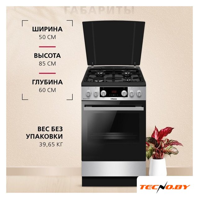 газовая панель + электрический духовой шкаф, поверхность: нержавеющая сталь, энергопотребление A, управление механическое, таймер электронный, размеры (ШхГхВ): 50x60x85 см, цвет нержавеющая сталь