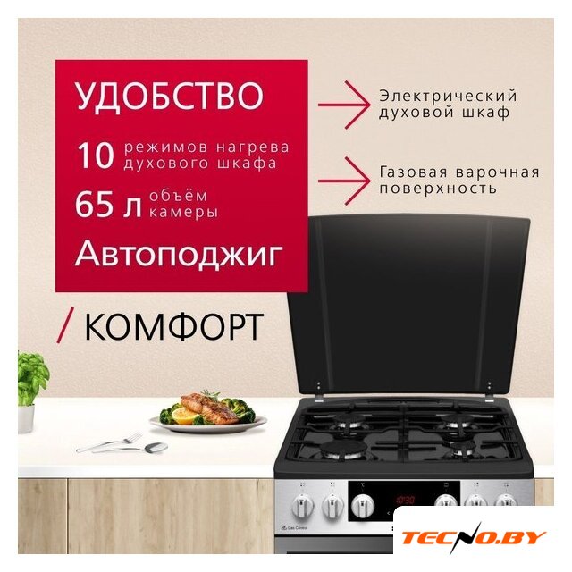 газовая панель + газовый духовой шкаф, поверхность: нержавеющая сталь, крышка из закалённого стекла, управление механическое, таймер механический, размеры (ШхГхВ): 60x60x85 см, цвет нержавеющая сталь
