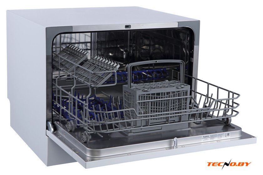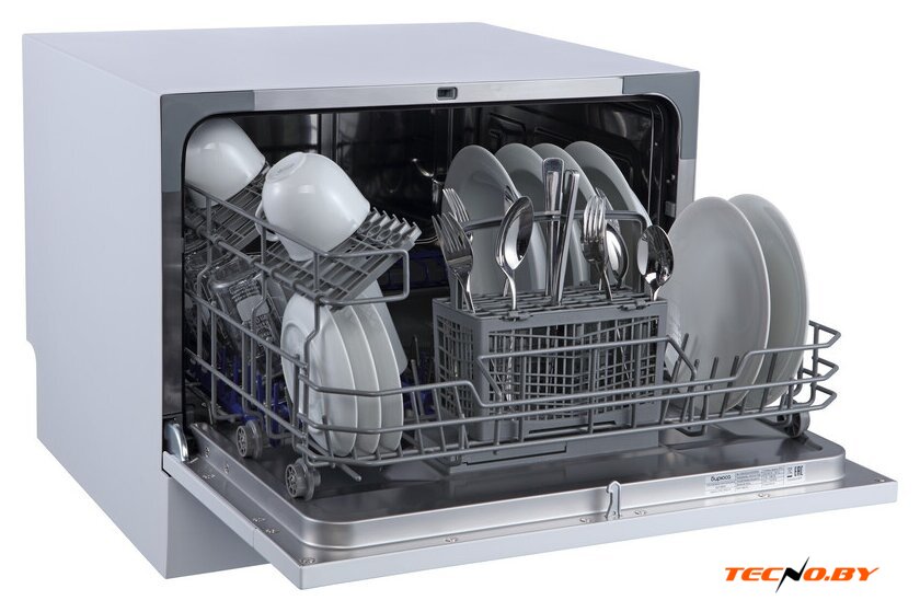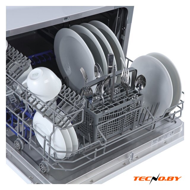 В комплекте с посудомоечной машиной идет корзина для столовых приборов, обеспечивающая оптимальную расстановку посуды. Однако модель не оснащена защитой от протечек и автоматическим дозированием моющего средства. Компактные размеры 55x50x43,8 см и вес 22.5 кг позволяют легко разместить ее в любом удобном для вас месте.