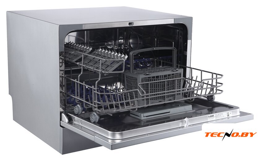 загрузка на 6 комплектов посуды, сенсорное управление, 5 программ, серебристый цвет, сушка: стандартная (конденсация), индикация на полу: нет