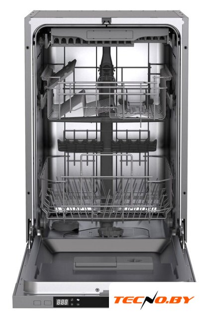Машина выполнена из нержавеющей стали, что не только придаёт ей современный вид, но и делает её устойчивой к загрязнениям и царапинам. Ширина всего в 45 см позволяет легко встраивать её в кухонный интерьер, экономя пространство. Доступная опция третьего короба для приборов добавляет удобства в использование данной техники.