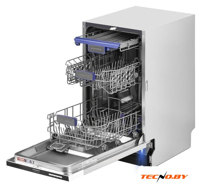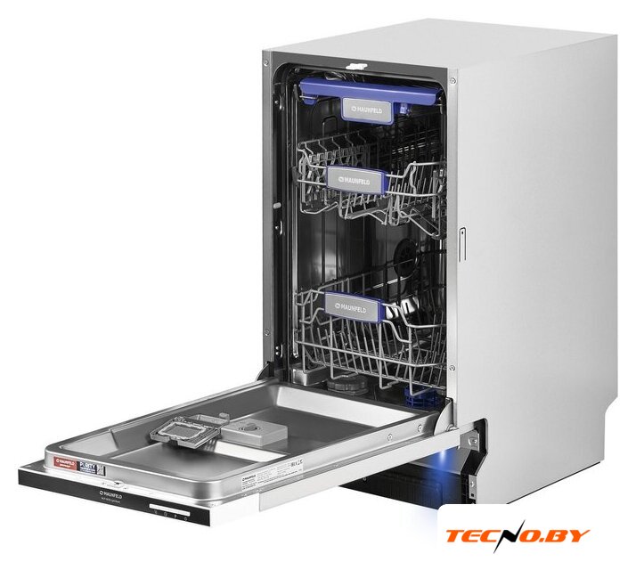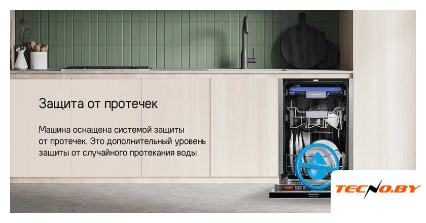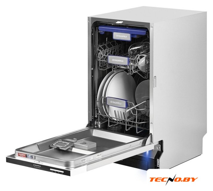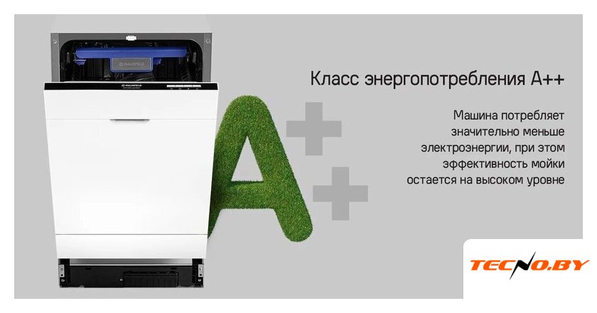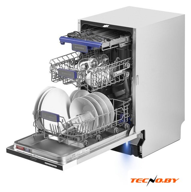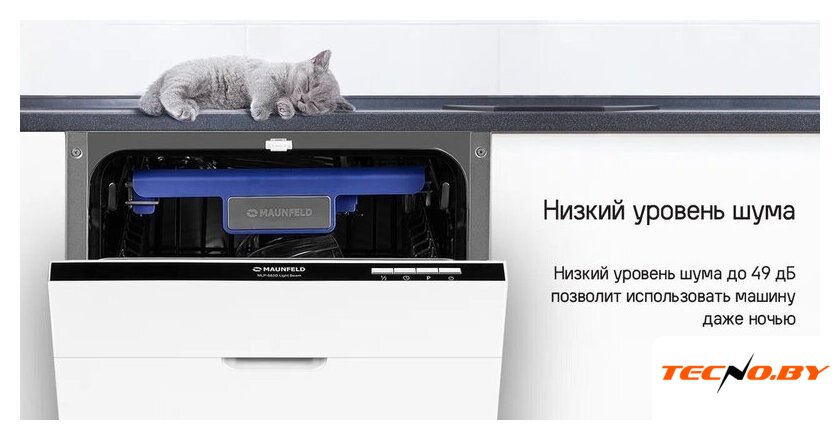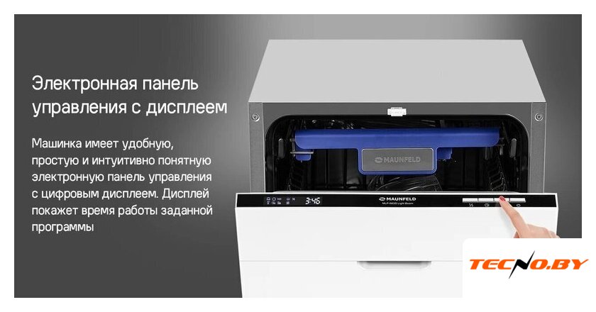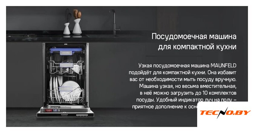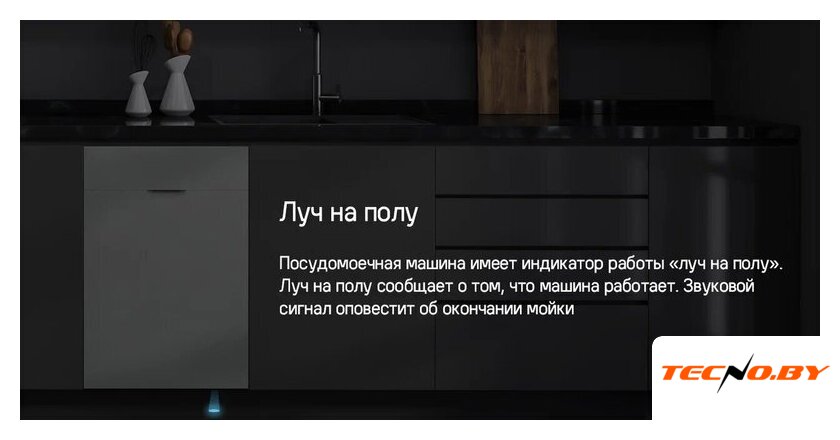 загрузка на 10 комплектов посуды, сенсорное управление, 8 программ, 44.8x55x82 см, черный цвет, сушка: стандартная (конденсация)/с открыванием дверцы, индикация на полу: луч