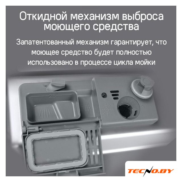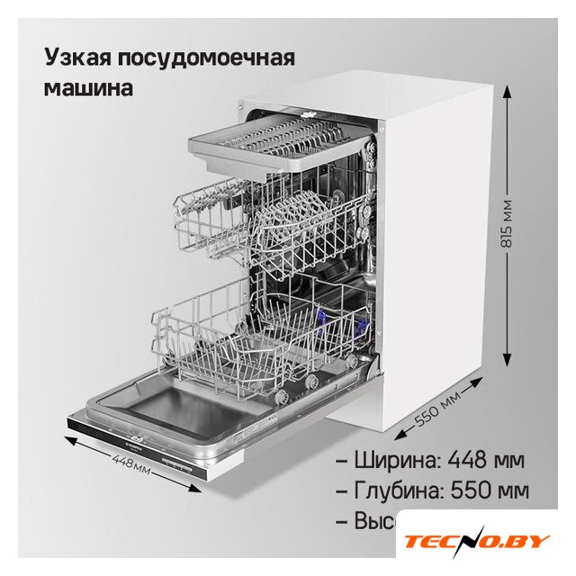 Машина компактна и удобна для встраивания: ширина 44.5 см, глубина 55 см и высота 81.5 см. Она легко найдет свое место на вашей кухне, занимая минимум пространства и предоставляя максимум эффективности. Весит всего 30 кг, что упрощает установку и интеграцию в мебельный ансамбль.