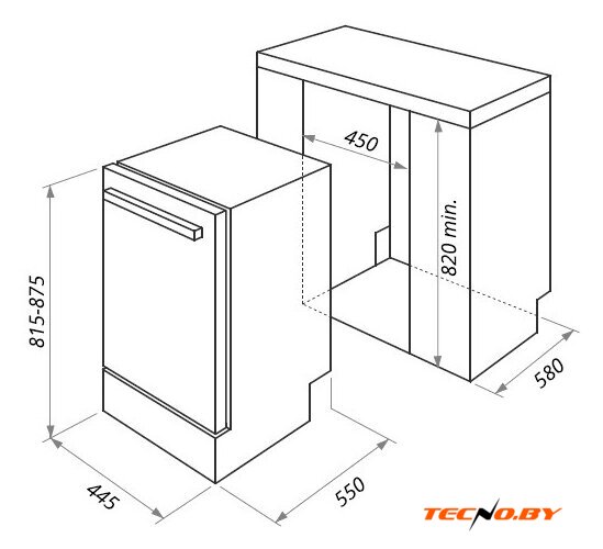 загрузка на 10 комплектов посуды, электронное управление, 8 программ, 44.8×55×82 см, черный цвет, сушка: конденсационная, половинная загрузка, индикация на полу: луч