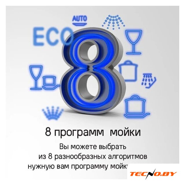 Богатый выбор из 8 программ, включая автоматическую, экономичную и деликатную мойку, обеспечит должный уход за различными типами посуды. Для более сложных загрязнений предусмотрена интенсивная мойка, а функция замачивания облегчает удаление стойких остатков пищи. Дополнительные опции включают сокращение времени мойки, дополнительную сушку и половинную загрузку для экономии воды.