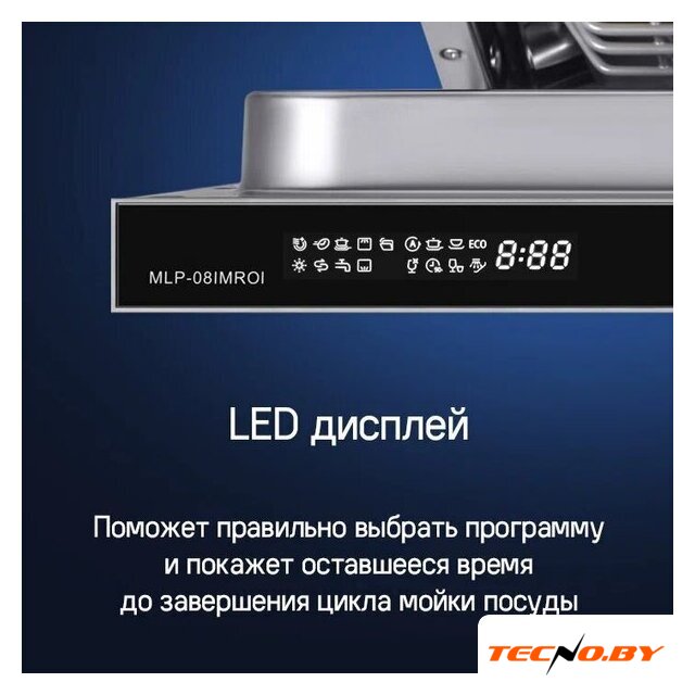 Управлять работой машины невероятно просто — все функции активируются с помощью сенсорной панели. Цифровая индикация и луч на полу позволят легко следить за состоянием процесса. Дополнительные индикаторы отсутствия соли и ополаскивателя помогут поддерживать технику в отличном состоянии. Для вашего удобства доступен таймер отложенного старта.