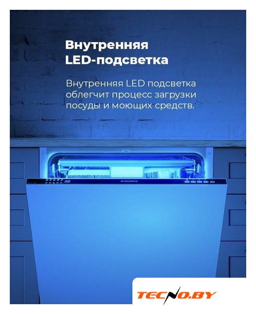 загрузка на 9 комплектов посуды, сенсорное управление, 8 программ, 44.6x55x82 см, черный цвет, сушка: с открыванием дверцы, индикация на полу: проекция дисплея