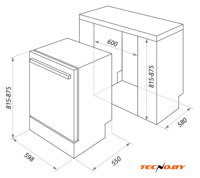 Размеры машины составляют 59.8 см в ширину, 55 см в глубину и 81.5 см в высоту, что позволяет без труда установить её в большинство стандартных кухонных ниш. Габариты для встраивания минимально определены как 60 см на 58 см в ширину и глубину соответственно, при минимальной высоте в 82 см.