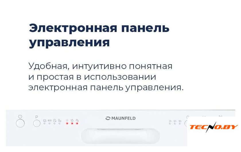 С MAUNFELD MWF12I легко управлять благодаря электронному управлению и светодиодной индикации. Таймер отложенного старта (3/6/9 ч) позволяет запустить машину тогда, когда это удобно вам. Индикаторы соли и ополаскивателя всегда предупредят вас об их отсутствии, обеспечивая оптимальные условия работы.